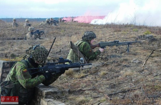 2015年3月6日,北约国家代号“2015-大西洋决心”实战军演在拉脱维亚境内开始,该国与俄罗斯是邻国。演习还是由美军主导,东道主拉脱维亚派兵进行支援。图为拉脱维亚陆军士兵与美军步兵协同演习。