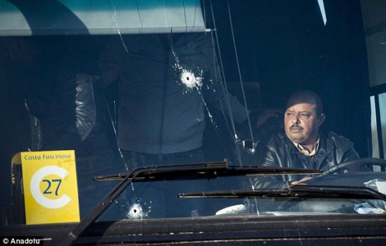 停在博物馆外一辆巴士的窗户因遭袭破损。(路透社)