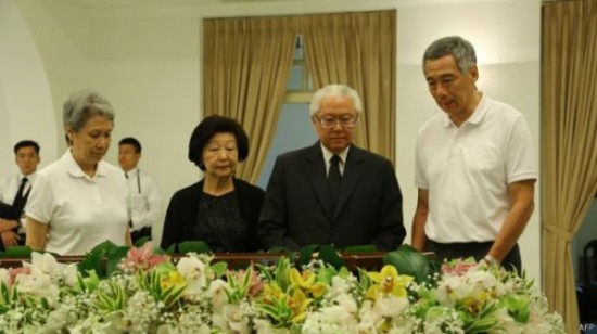 李光耀长子、新加坡现任总理李显龙(右一)及家人为李光耀守灵两天,总统陈庆炎(右二)带同夫人于23日前来吊唁。