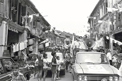 1972年9月,时任新加坡总理的李光耀在唐人街选区感谢选民的支持。