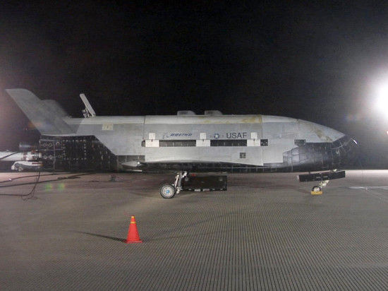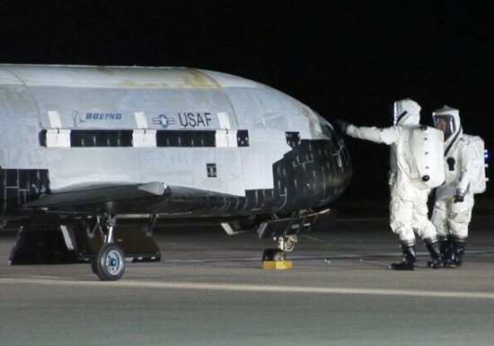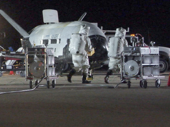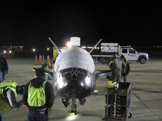 美国空军人员马上对着陆的X-37B飞行器进行了全面检查。
