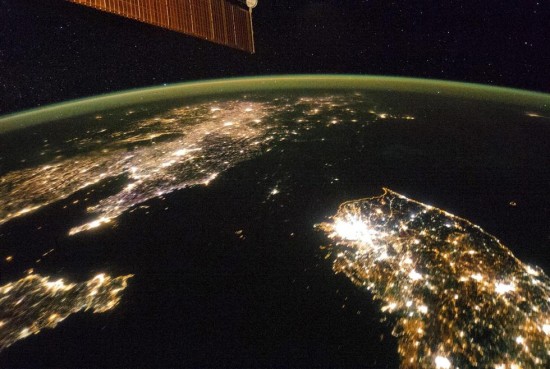 1月30日,国际空间站38名宇航员在飞越东亚上空时曾拍摄下来一张朝鲜半岛的夜景,和白天不同的是,夜间灯光强度的差别强烈地勾画出了两国经济水平的不同。从这张照片上可以看出,韩国首尔是一个灯火通明的城市,相反,北朝鲜的夜晚几乎完全笼罩在黑暗中,在黄海和日本海中间就像连绵不断的水,其中的平壤看起来就像一个小岛。