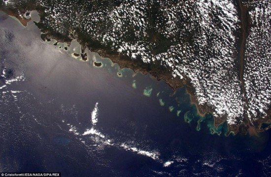当空间站飞行到非洲上空时,一位宇航员记录下莫桑比克的海岸线,纵深、平静的海湾,起伏、多岩石的山峰,大西洋的海风吹过,锯齿状的岩石峭壁下海浪翻滚。