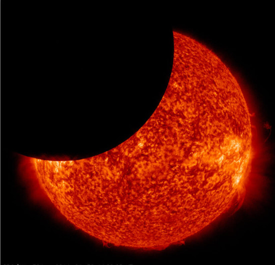 1月30日8点30开始?月亮移动到美国宇航局的太阳动力学天文台与太阳之间,使得他们拥有了一个在太空观察日偏食的独特视角。
