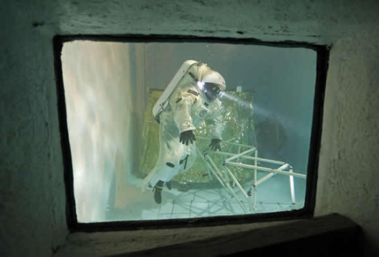 10月22日,国家潜水学校总监Jerome?Vincent,,穿着Gandolfi的太空服,做列车到马赛游泳池做2014年的水下测试环节,发展欧洲的专业知识在太空行走模拟下局部重力探索月球。