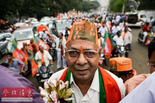 资料图片:在印度安德拉邦港口城市维沙卡帕特南,一名人民党的支持者参加游行庆祝人民党在大选中获胜。新华社记者郑焕松摄