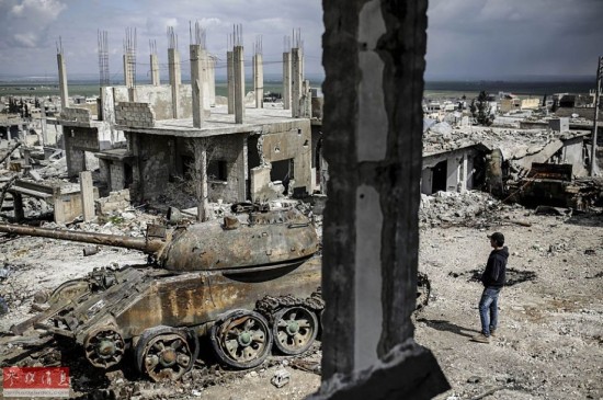 3月22日,在叙利亚艾因阿拉伯(又称科巴尼),一名少年站在坦克残骸旁。新华社/法新 ??