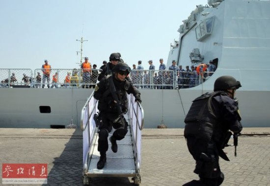 资料图:4月2日,在也门亚丁港,“临沂”舰靠岸后,海军陆战队队员迅速跑下舷梯,在划定区域警戒。(新华社记者潘思危摄)