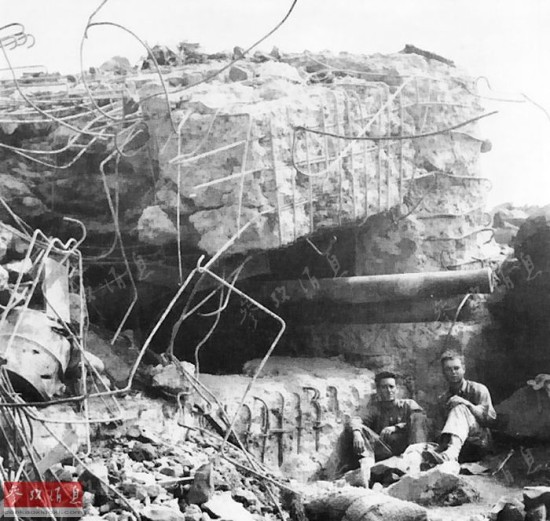 两名美军士兵在硫磺岛日军被摧毁的120毫米重炮掩体旁合影,摄于1945年。