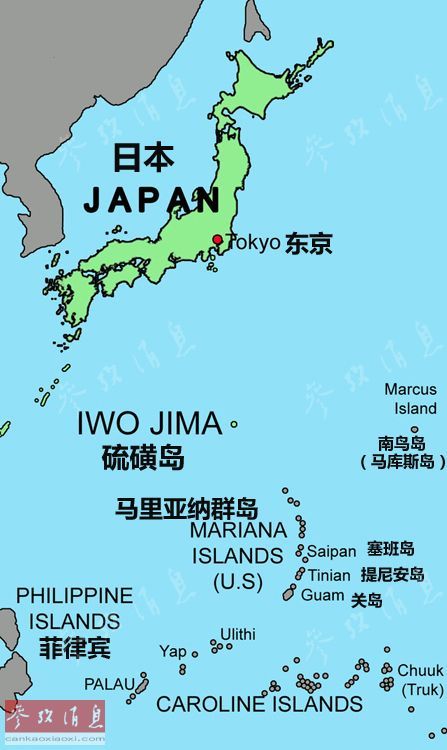1945年2月,由于日军已丧失了制海权和制空权,硫磺岛和小笠原诸岛成为了防止美军空袭日本本土的最后一道防线,而对于美军来说,拿下硫磺岛,并在其上修建机场,能够大幅提升B-29轰炸机群对日本政治和工业核心的东京进行战略轰炸的效率。图为硫磺岛位置示意图。