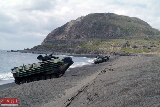 图为2003年3月12日,美海军陆战队AAV7A1两栖突击车编队驶上硫磺岛滩头,纪念硫磺岛战役58周年。