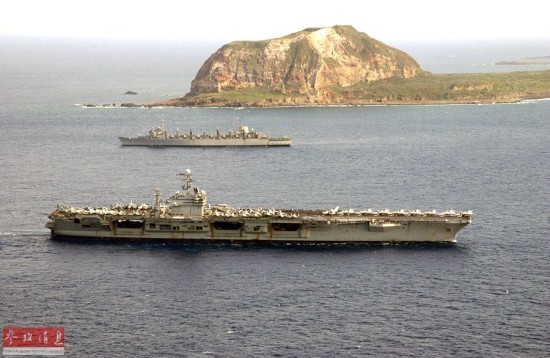 为纪念硫磺岛战役58周年,美军文森号核航母通过硫磺岛附近海域,摄于2003年5月。