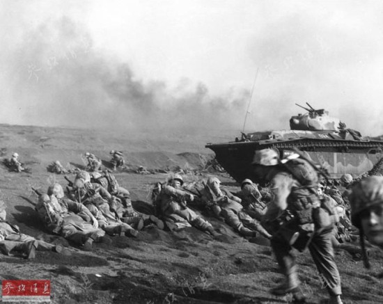 图为美海军陆战队士兵在两栖战车掩护下冲锋,摄于1945年。
