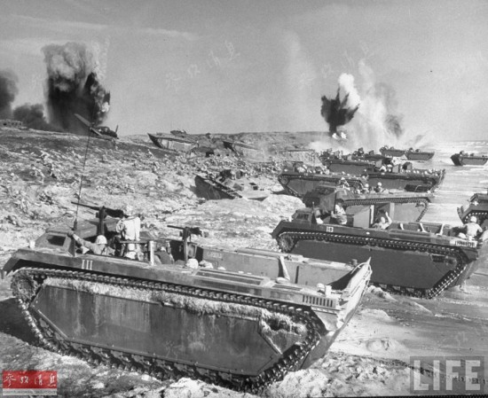 美军两栖突击车冒着日军炮火,抢滩硫磺岛。图片来源:美国《生活》杂志。