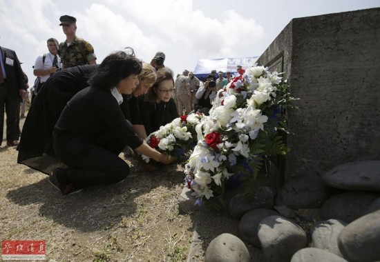 3月21日,硫磺岛战役阵亡士兵家属在硫磺岛向纪念碑献花。新华社/美联?