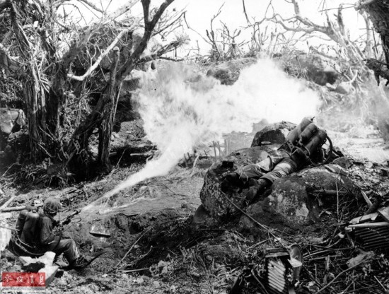 图为美军在硫磺岛上用火焰喷射器消灭隐藏在掩体中的日军,摄于1945年。