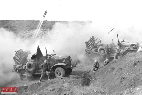 美海军陆战队使用车载多管火箭炮压制硫磺岛日军,摄于1945年。
