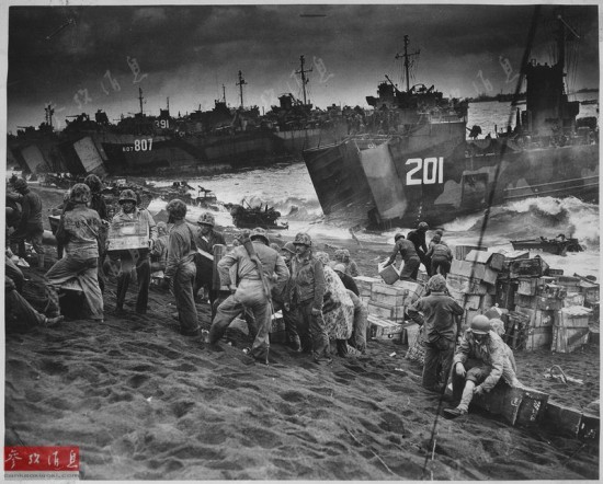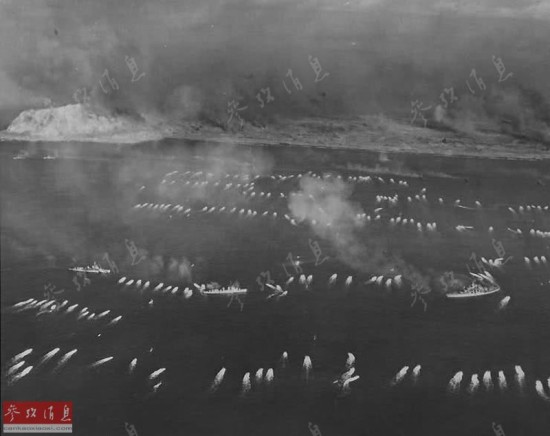 图为美海军陆战队第一批突击兵力抢滩硫磺岛,图中的白色浪痕均为美军两栖突击车群或登陆艇,摄于1945年2月19日。