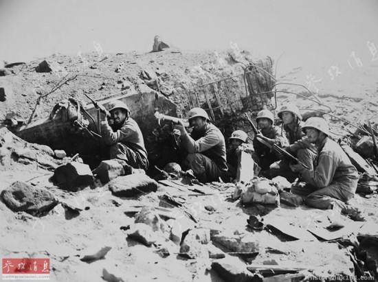 美军陆战队第23团第3营的士兵从被毁的日军碉堡中开火,摄于硫磺岛,1945年2月。