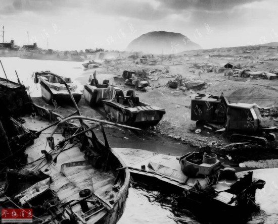 硫磺岛滩头被毁的美军登陆艇和两栖车辆。
