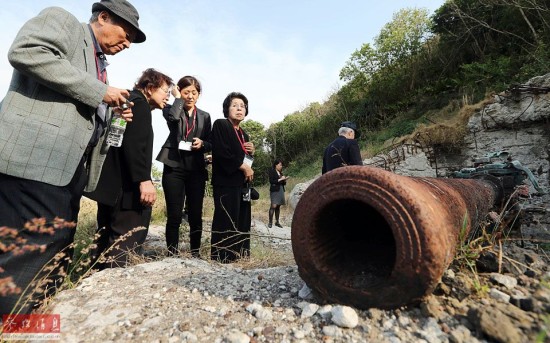 3月21日,硫磺岛战役阵亡士兵家属在硫磺岛观看炮台遗址。新华社/美联?
