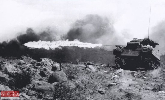 为了对付隐蔽在暗堡中的日军,火焰喷射器成为了美军的首选武器。图为一辆美军M4A3R3喷火坦克向硫磺岛日军掩体喷射火焰,摄于1945年。
