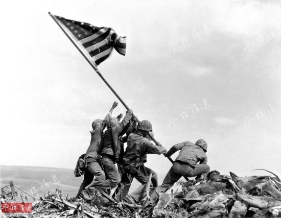 图为最著名的美军在折钵山上升起美国国旗(硫磺岛上的第二面美国国旗,大旗),实为摆拍。