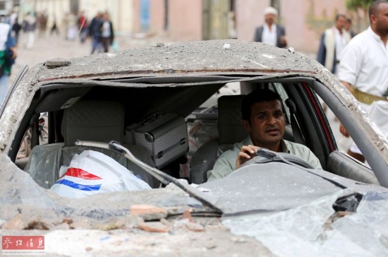 4月8日,在也门萨那,一名男子坐在遭空袭损毁的汽车内。从3月26日开始,沙特阿拉伯、科威特、卡塔尔等国对也门胡塞武装组织控制的地区发动代号为“果断风暴”的空袭行动。世界卫生组织4月7日说,过去几周,也门的激烈冲突造成540余人死亡,另有大约1700人受伤。新华社/路透