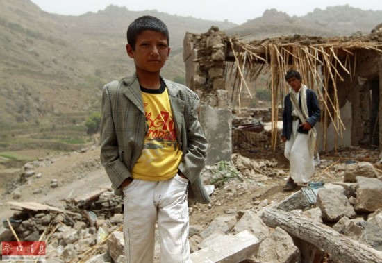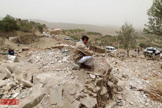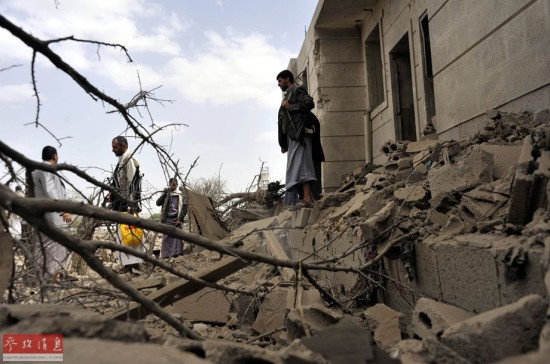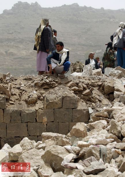 4月4日,也门当地村民站在被损毁的房子废墟上。沙特等国3日晚继续对也门进行空袭。也门首都萨那西部一个村庄在空袭中被击中,导致9人死亡。