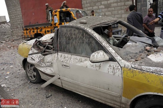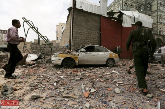 但不幸的是,26日的空袭行动误炸了一处平民区,造成至少75人死伤。图为2015年3月26日,也门首都萨那,大批民用车辆在空袭中变成废铁。