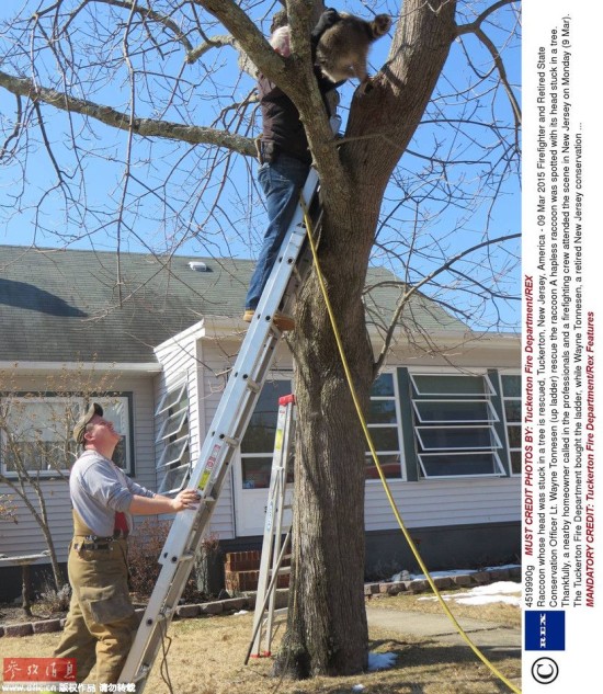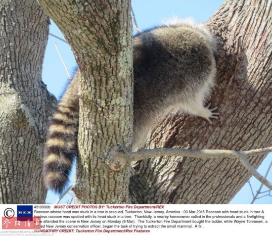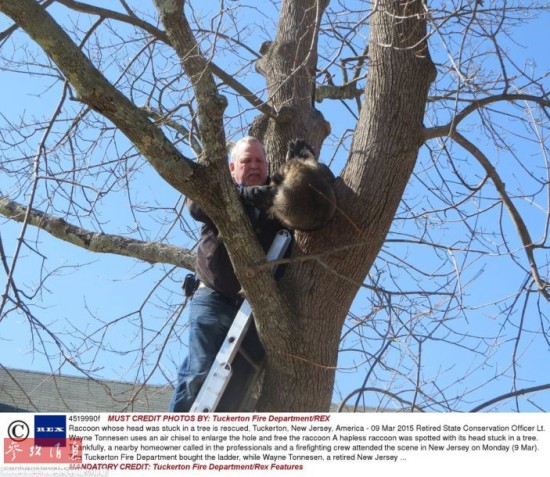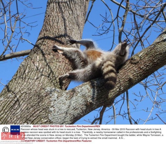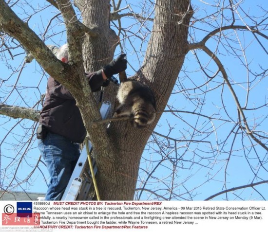 当地时间2015年3月9日,美国新泽西,一只浣熊的脑袋被卡在了树上,动弹不得。附近的居民见状,赶忙叫来了专业人士和消防人员参与救援工作。