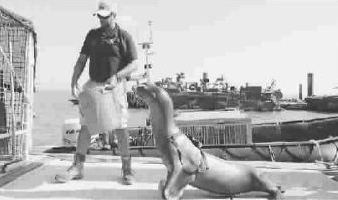 美军海豚训练师哈雷特中士讲述了海豚排雷的作业情况。首先,美军先派出几艘声呐探测船勘察港口周围水道,标出200余处危险区域。随后,“海豚兵”开始行动,利用自己发出的声波搜寻海中的爆炸物(经过严格训练的海豚能在150米的距离内,分辨出水雷上玉米粒大小的惯性撞针)。另外,海豚还能携带水下摄像机,对危险目标进行精确辨别。一旦发现了危险目标,“海豚兵”就会游到训练师所在的气艇旁,用鼻子敲击艇舷上的球形控制器,表示自己找到了目标,然后向训练师索取灭雷炸弹,并将其放在水雷旁。最后,引爆灭雷炸弹,炸毁水雷。