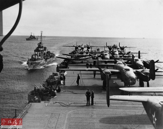 图为准备从大黄蜂号航母上起飞空袭东京的杜立特B-25机群。