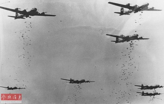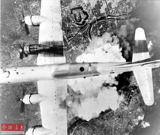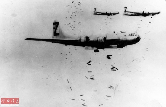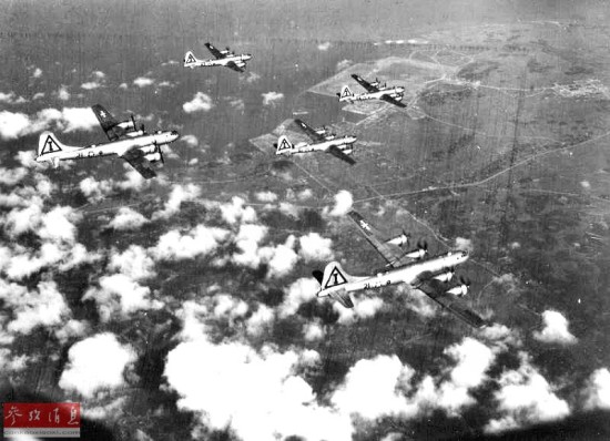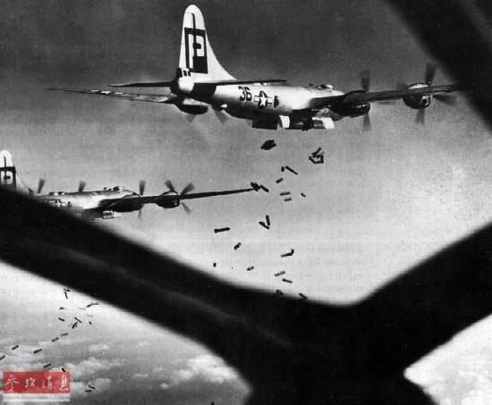 图为驻扎于关岛的B-29机群在日本空袭时的图片。