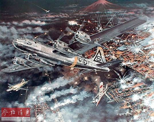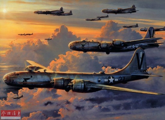 图为轰炸长崎的B-29机群绘图,图中还能看到护航的P-51战机。
