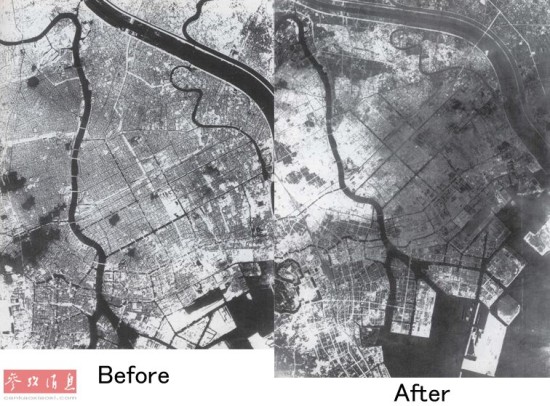 东京大轰炸前后航拍对比图,右侧的航拍图可明显看出空袭后,大批建筑物已被夷平。