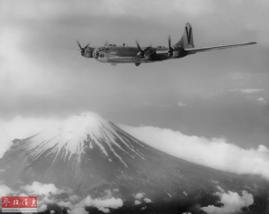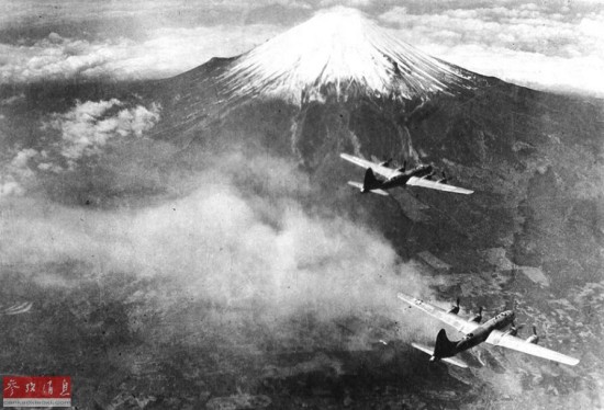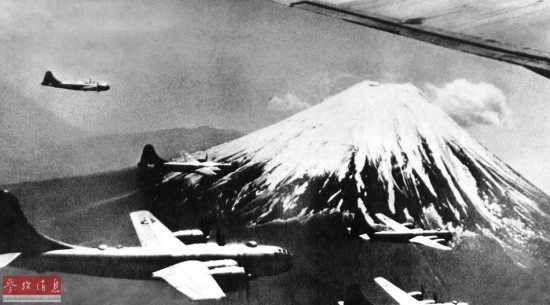 ?图为1945年,飞越富士山的B-29机群,由于目标明显,富士山是当年美军空袭编队的理想集结点。