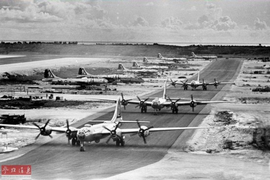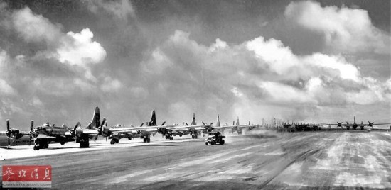 准备从提尼安岛(位于马里亚纳群岛)起飞轰炸日本的美军B-29机群,摄于1945年。