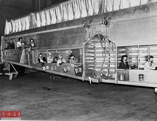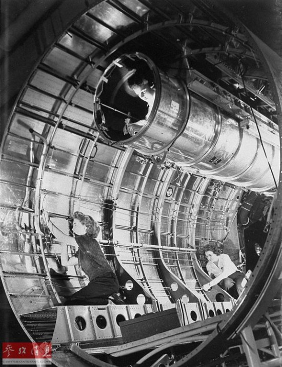 图为女工们在B-29机翼内部完成涂装工作,可见机翼的尺寸之大。