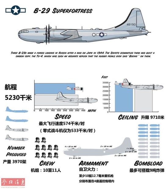 通过这张示意图可以直观地看出B-29优秀的作战性能,各项指标都显示出该型机是轰炸日本本土的不二之选。
