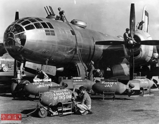 ?历次空袭出击前,在炸弹上涂鸦是美军的传统,图中美军地勤人员就在炸弹上写上了诸如“东京毁灭者”(Tokyo Busters)的标语。