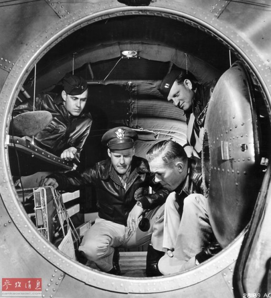图为B-29机组成员在后部机舱交谈,图中能看到圆形舱门附近的密封结构,由于飞行高度较高,B-29的座舱内部均采用了增压座舱, 本图摄于1944年6月。