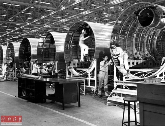 ?图为工人们在波音伦顿工厂内组装B-29机身部件。