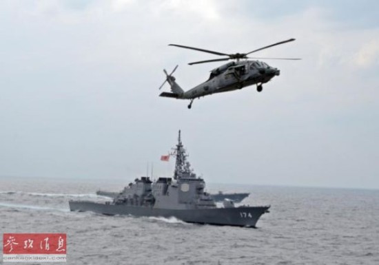 资料图片:“利剑”美日军演中,美军“海鹰”直升机在日本“雾岛”号。