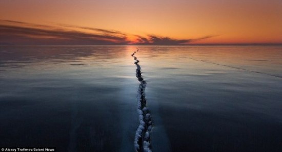 近日,俄罗斯摄影师Alexey?Trofimov就捕捉到了冰冻的贝加尔湖湖面上数百米长的冰裂,裂缝仿佛绵延至天际,映衬在夕阳中,显得美妙绝伦。