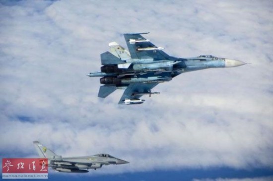 英国皇家空军的“台风”战机(下)紧随俄空军苏-27战机飞行。