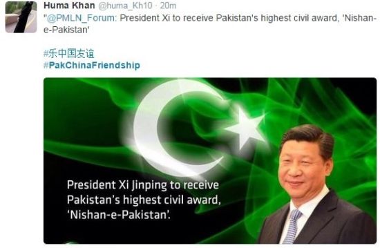 根据巴基斯坦媒体消息,习主席将会接受巴基斯坦的最高勋章“巴基斯坦勋章”(Nishan-e-Pakistan),很多人也转发了这条消息: