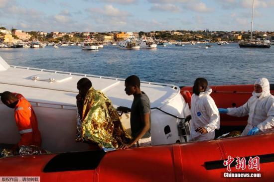 当地时间2月11日,意大利蓝佩杜萨岛,联合国难民署发言人表示,一艘非法移民船只在地中海倾覆。图为获救者乘船上岸。