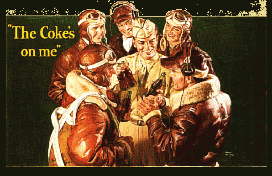 为了鼓吹自己的爱国者形象,可口可乐为广播节目《胜利大游行》提供赞助,他们雇请了100多个乐队在全国各军事基地演奏,宣扬美国必胜。图为1943年,背景是美军轰炸机的可口可乐广告。