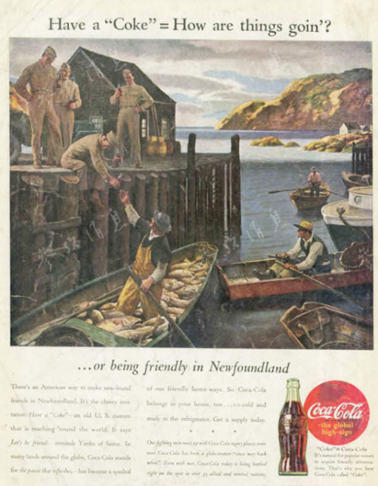 二战期间,可口可乐公司在世界各战区共建立了64家装瓶厂,总计卖出100亿瓶饮料。图为1944年,美军向纽芬兰渔民表达善意。